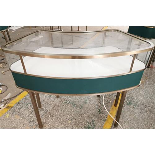 對于這種弧形珠寶展示柜,在定制過程中應注意熱彎玻璃與不銹鋼之間的接合縫隙。尺寸越小,縫隙越小,誤差越小,效果越好,因此手工效果好,質量強