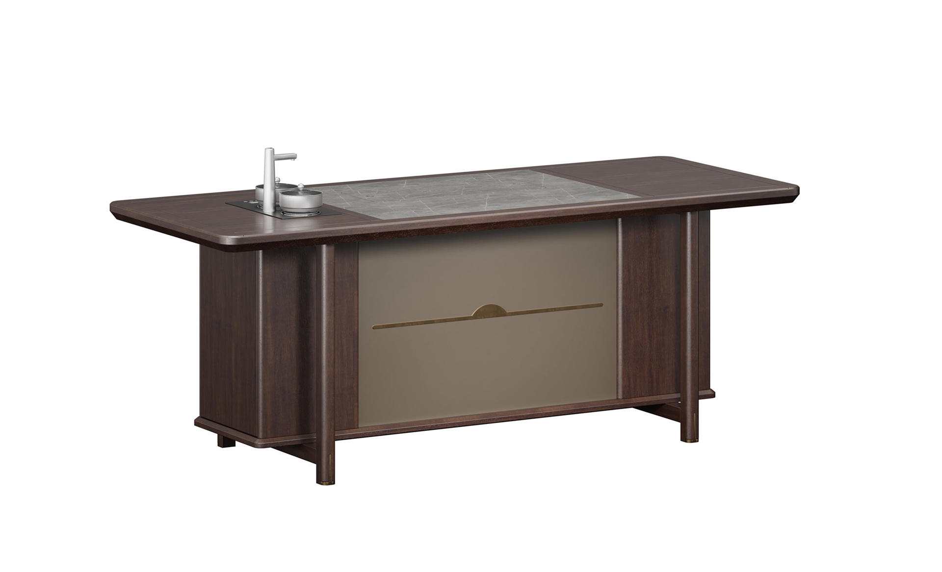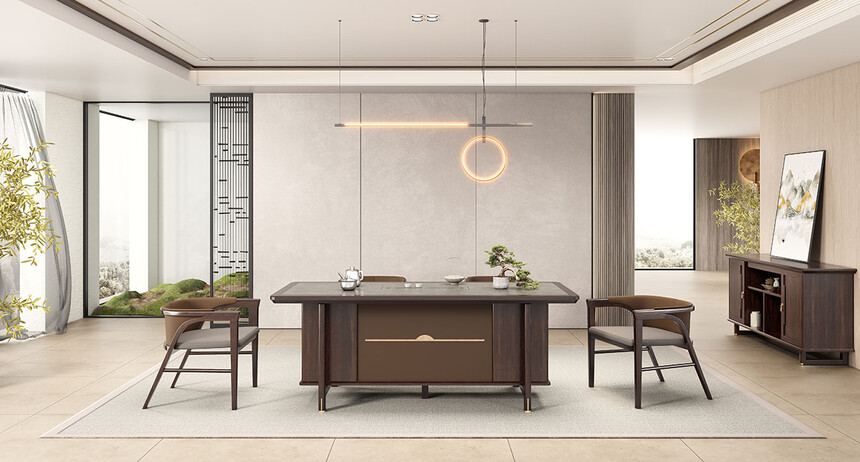 鴻泰系列在造型上主要采用硬朗簡潔的直線條,溫潤的烏金木與質(zhì)樸的巖板相結(jié)合,剛?cè)岵?jì),時(shí)尚大方,既使得中式家具古典、質(zhì)樸的內(nèi)涵顯現(xiàn),又符合現(xiàn)代辦公追求的時(shí)尚感、實(shí)用性。