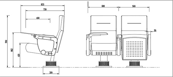 1.座寬(扶手中對中):580mm,座椅總高:990±10mm,座高:450±10mm。座椅深度:823±10mm,扶手高662±10mm:最小排距:900mm。